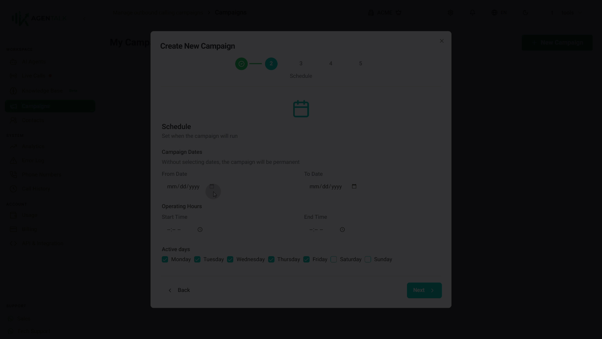If you leave the start and end dates empty, the campaign runs continuously within the operating hours you define.