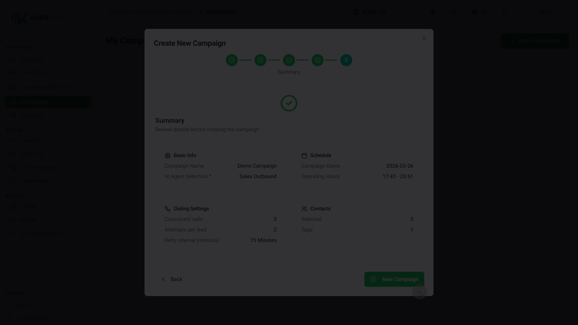 Confirm everything is correct, and click **New Campaign**.