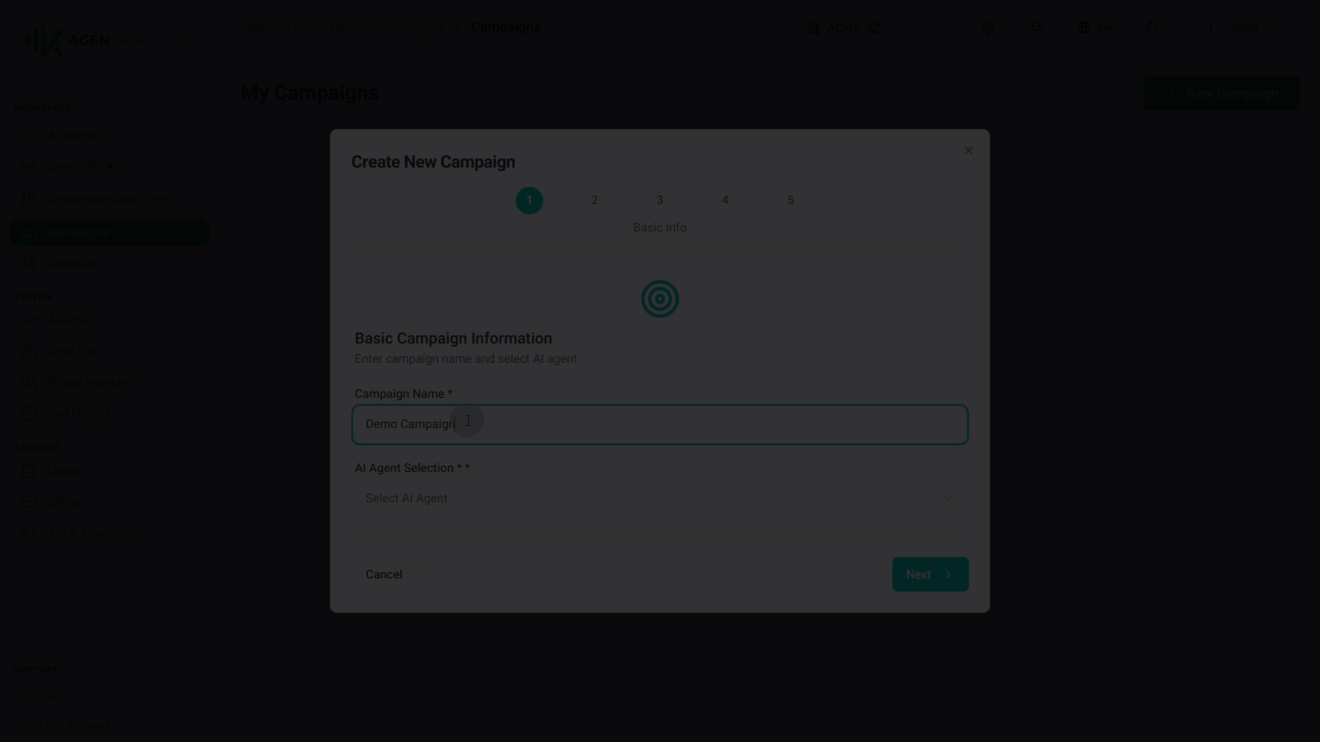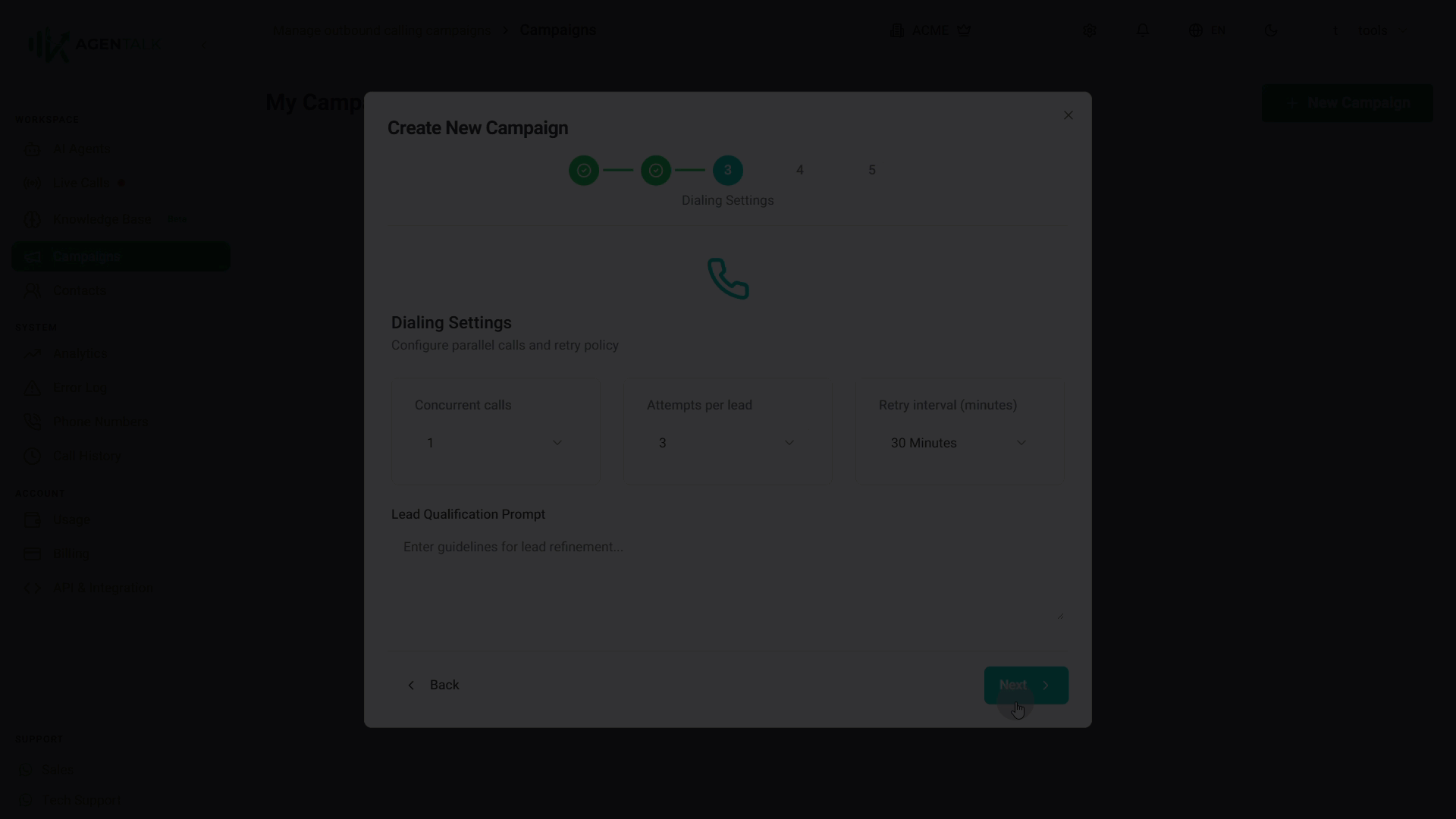 An outbound campaign automatically calls a list of contacts using your AI agent. You configure all campaign settings in one place, then activate it to start dialing.